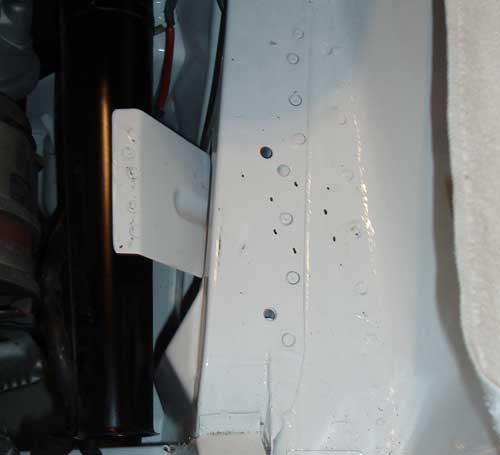 The wheel wells presented a challange. I wanted them in body color white for "show", but I did not look forward to getting that chipped up when driving. The areas were media blasted, and given the 2 prime coats at AR. I scuffed that down a bit, applied a few coats of 3M Body Schulz to provide a resiliant layer. First photo, the front wheel well in panitable undercoating.