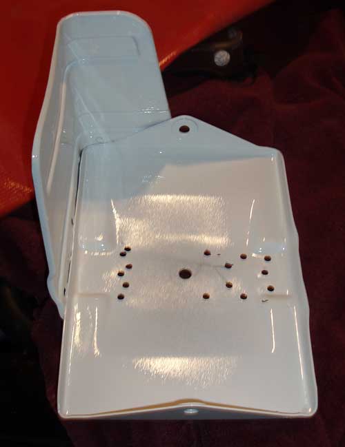 I painted the assembly to match the engine bay. The matching upper battery hold down frame was bought also, and it will be secured with two standard threaded rods. The tray holds the original battery rubber tray perfectly! I am planning on using an Odyssey Drycell Battery (it has a red top...)